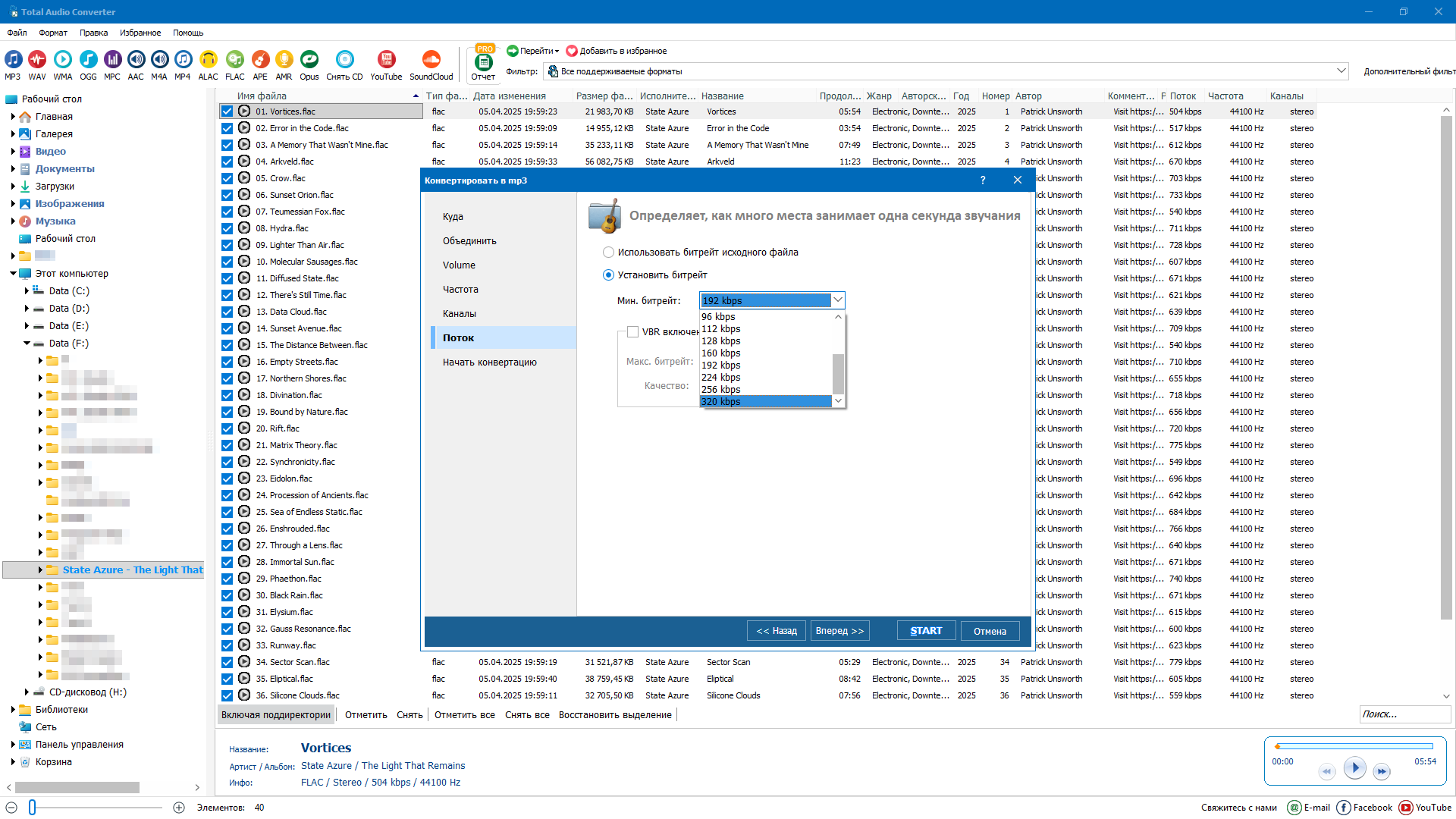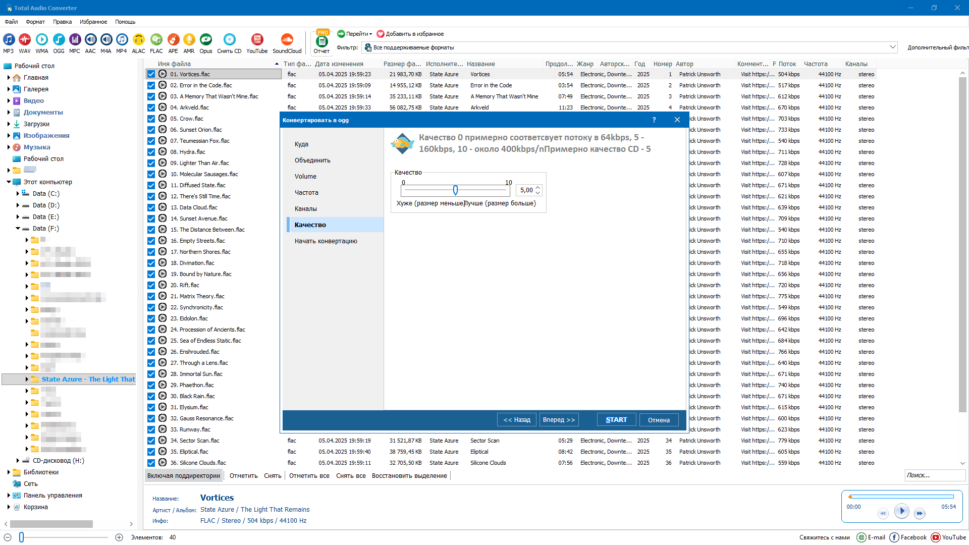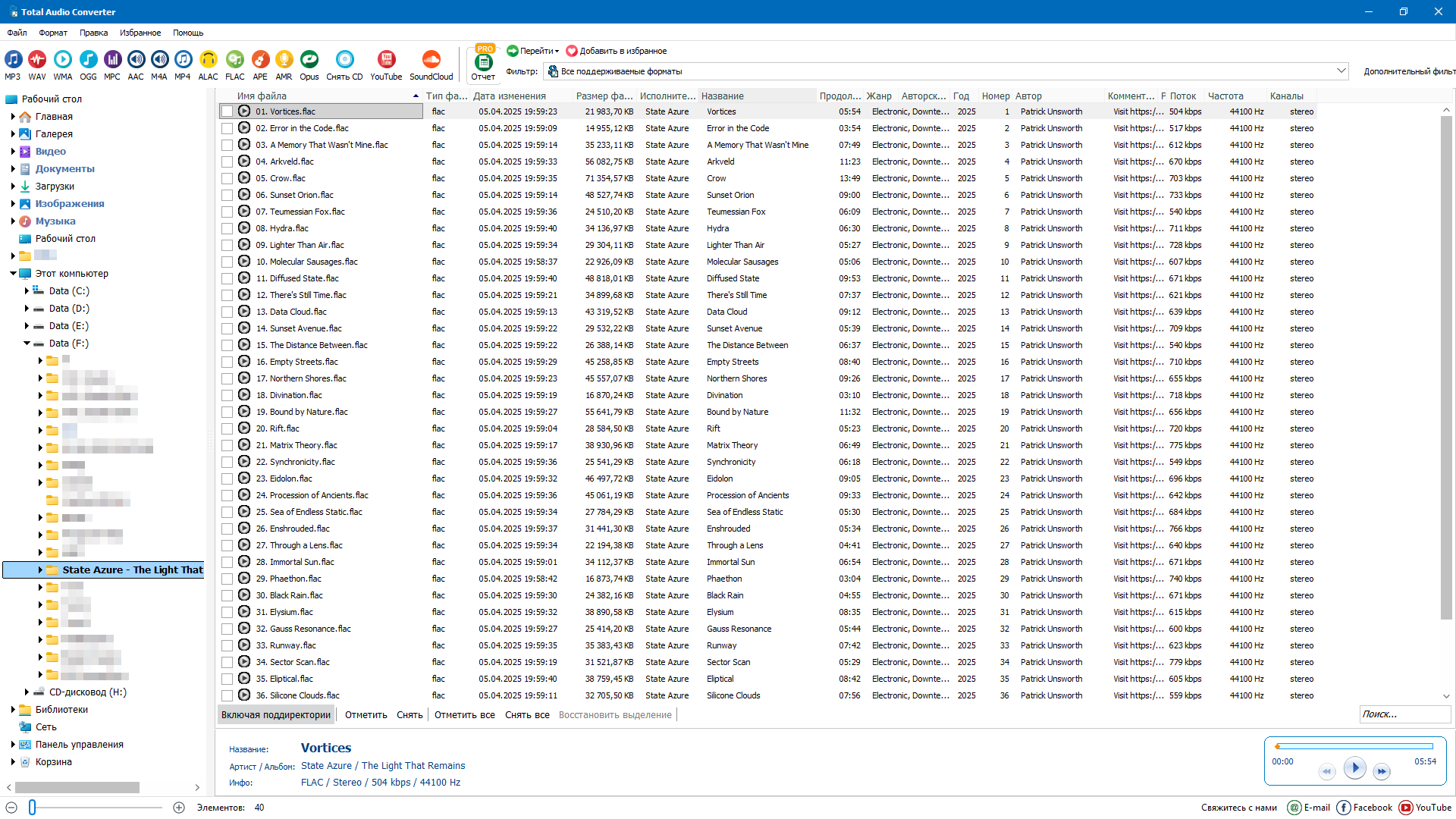 Total Audio Converter - мощный конвертор всех музыкальных форматов файлов и возможностью CD-риппинга. Программа поддерживает теги ID3 и CUE файлы, преобразовывает аудиотреки без создания промежуточного WAV файла, работает в пакетном режиме, имеет высокую скорость работы, по завершении процесса позволяет проиграть файл, а наличие понятного русскоязычного двухпанельного интерфейса с окном помощника, обеспечивают простоту и увлекательность процесса.