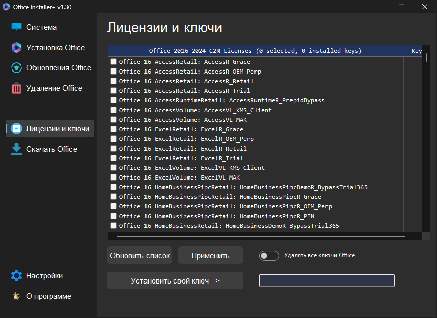 После удаления офиса штатными средствами в системе остаются его лицензии и ключи. Если у вас ранее был установлен, например, Office 2016, вы его удалили и установили Office 2024 - может так получиться, что в свойствах офисного приложения вы увидите не Office 2024, а Office 2016. Чтобы такого не произошло, желательно после удаления старого офиса в разделе программы "Лицензии Office" посмотреть оставшиеся в системе лицензии и удалить ненужные. Если удалять лицензии с включенным переключателем "Удалить ключи" - из системы удалятся ключи, с которыми был установлен старый офис.