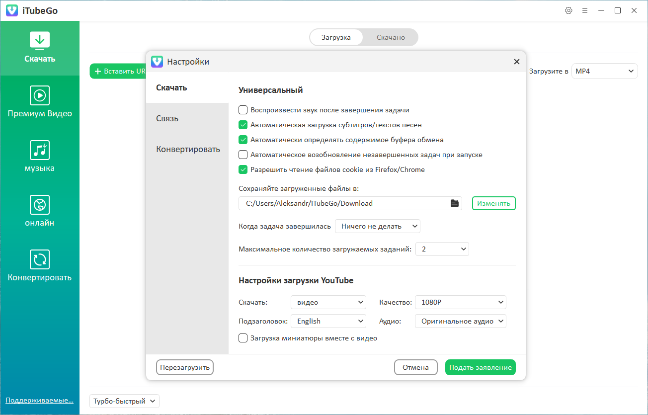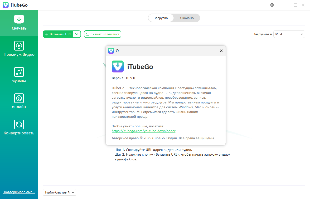 Являясь мощным загрузчиком HD-видео для YouTube, Dailymotion, Facebook и других потоковых сайтов, iTubeGo HD Video Downloader обеспечивает в 10 раз более высокую скорость для массовой загрузки высококачественных видео. Кроме того, он предоставляет встроенный браузер для простой загрузки видео и музыки и преобразования Youtube в MP4, MP3 и другие форматы.